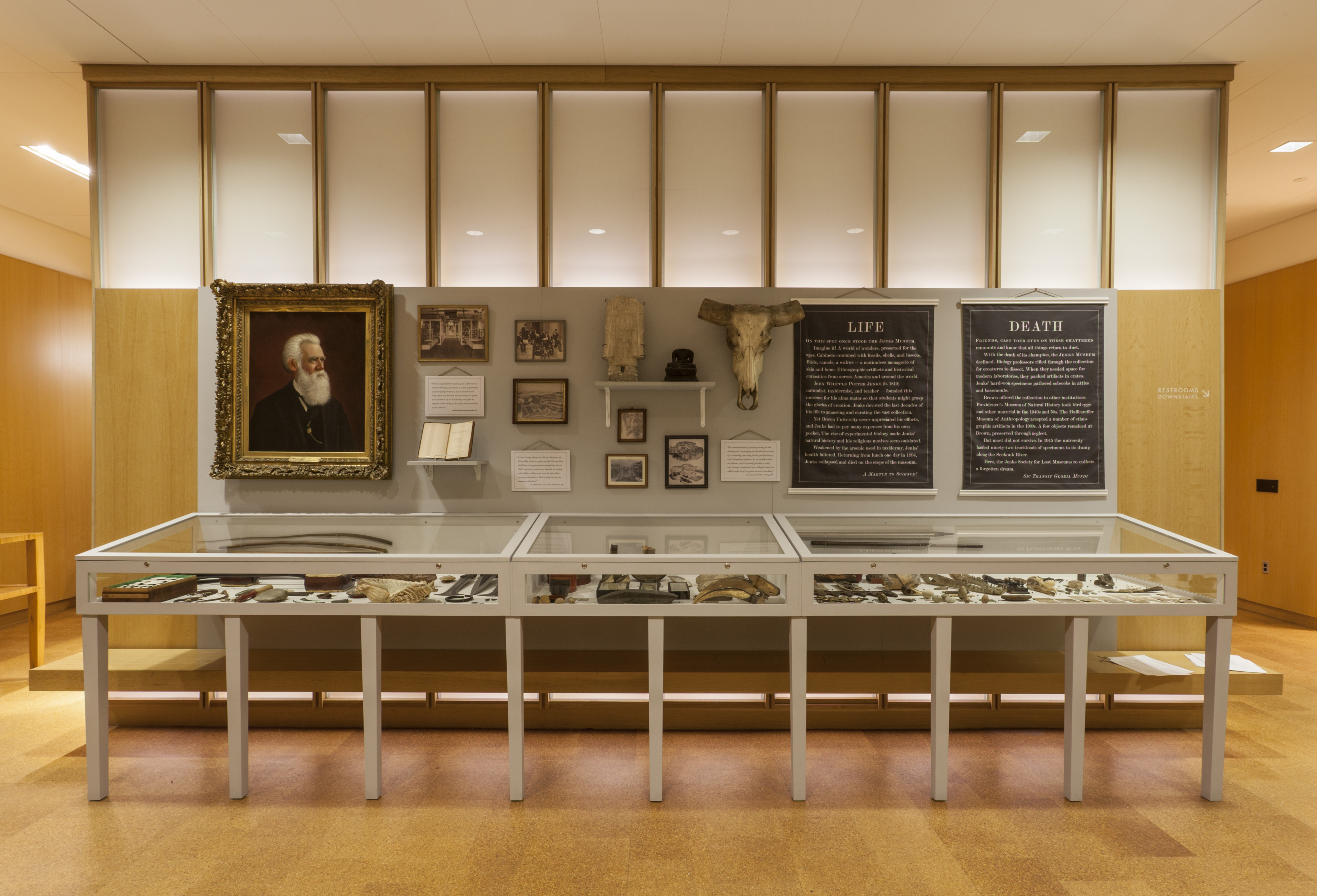 For the exhibition, I worked with two other graduate students to curate the display of fragmented remnants from the actual Jenks Museum. The three of us carried out archival research on the life of naturalist J.W.P. Jenks, his collection, and its sad fate. After tracking down Jenks specimens and artifacts that survive in area institutions, we selected approximately 100 of them to borrow. We then wrote the exhibit text, arranged our objects according to a logic of decay, and worked with designers and installers to complete the display. This case functions as a memento mori, a reminder of the ephemerality and fragility of collections.